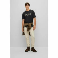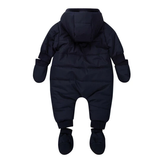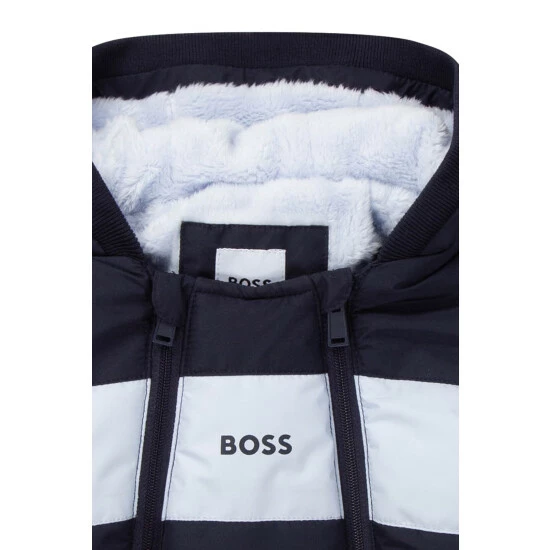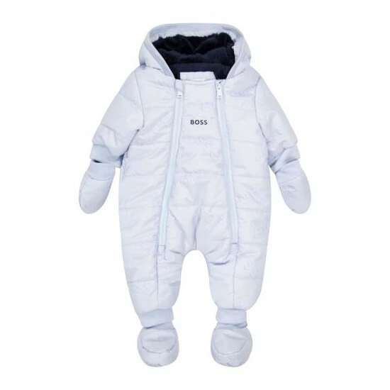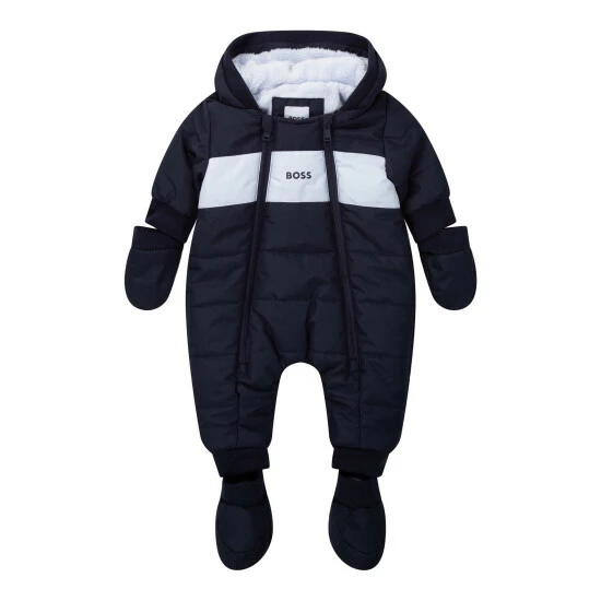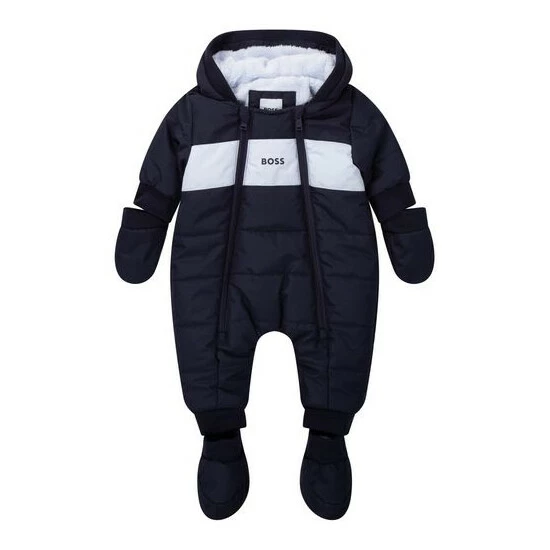 Recycled polyester hooded snowsuit Allover BOSS. Repellent. Faux-fur lining. Double-zip fastener. Removable mittens and booties with snaps.