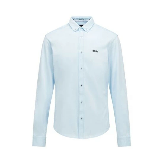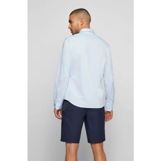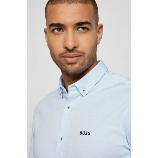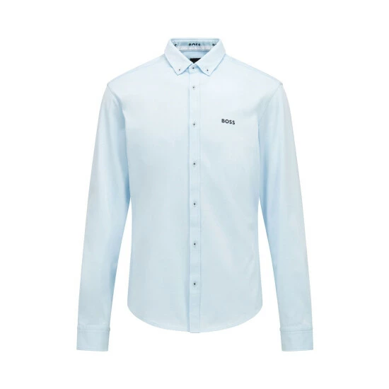 Soft jersey shirt. Seasonal pattern on inside collarstand. Straight boss logo in contrast colour. Stretch guarantees freedom of movement.
