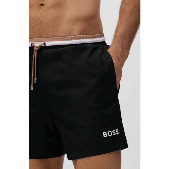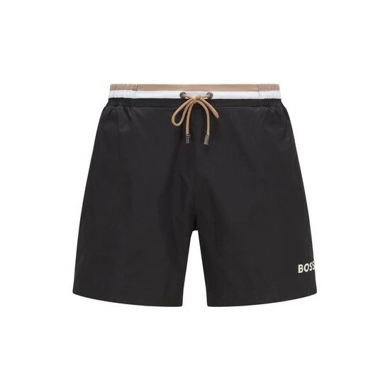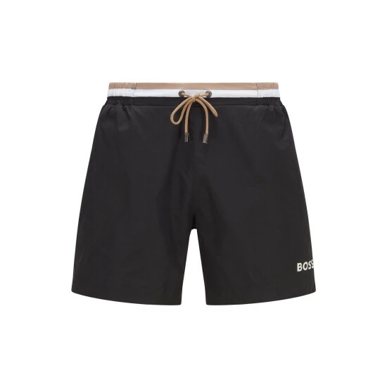 Ripstop polyester fabric. Half fixed waistband/outer cords with metal cord ends. One solid executions with corporate stripes allover the waistband, other with allover repeated big corporate stripes print. BOSS logo print on the leg. Back pocket.