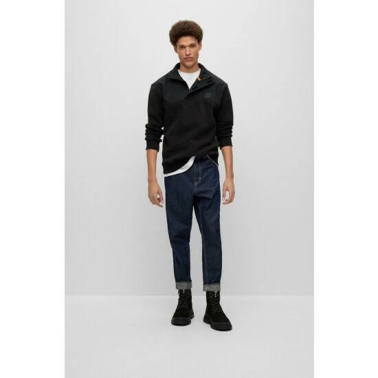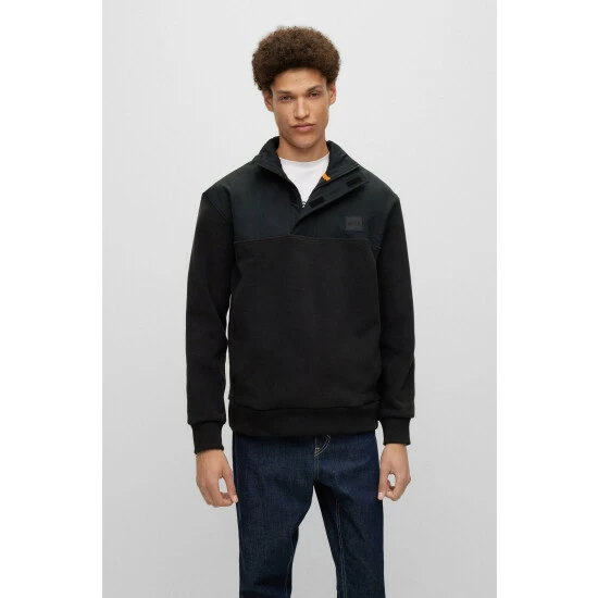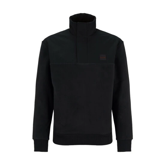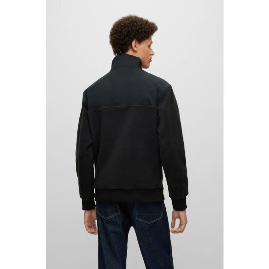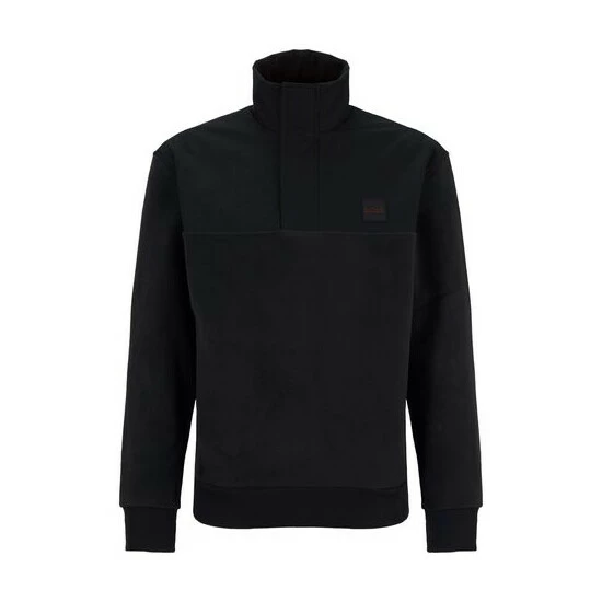 Polar-fleece fabrication with soft touch and cosy feel. Woven twill fabric for upper body and collar. Concealed zipped placket. Two-tone silicone patch at left sleeve.