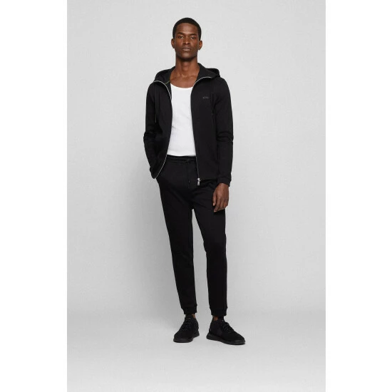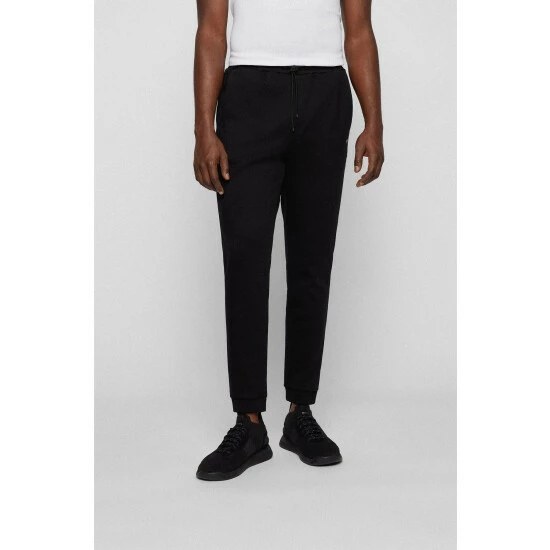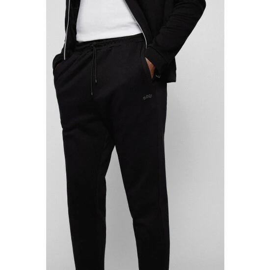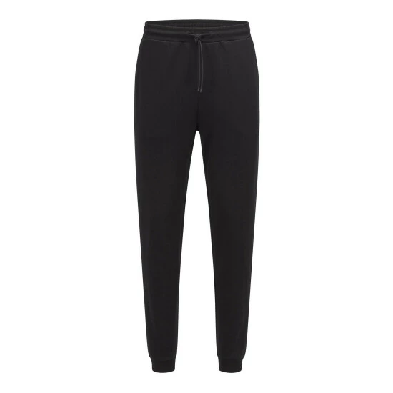 Basic jersey trousers with cuffed hem, responsible quality, main quality combined with tonal pique structure, curved layered logo, smart contrast details on logo, short dipped cord ends.