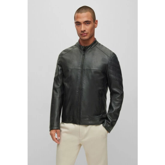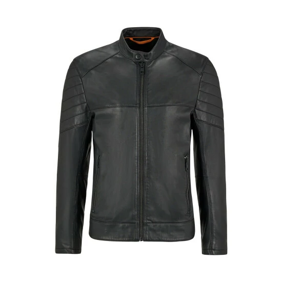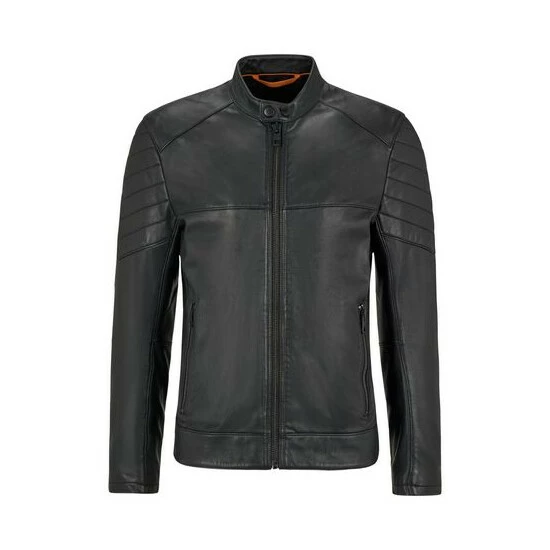 Authentic Biker Jacket with quilted details at sleeve, shoulder and lower back. Chunky, masculine zipper, very supple, lightly waxed and hand treated leather. Orange piping in the center back neckline and orange hanger loop.