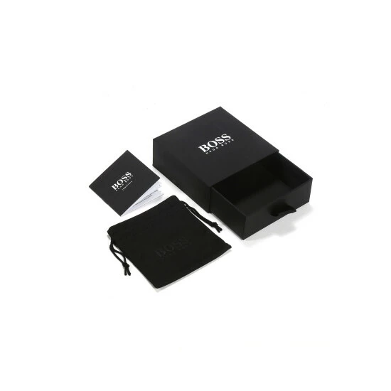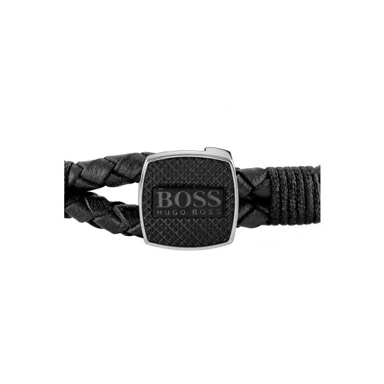 Contemporary masculinity. The BOSS Jewellery Seal bracelet collection combines two strands of braided leather with a distinctive cufflink-style button, inspired by the brand s iconic tailoring. With a logo-engraved guilloché finish, the stainless steel button secures with a woven leather loop for a relaxed look. Width 3mm and length 19cm.