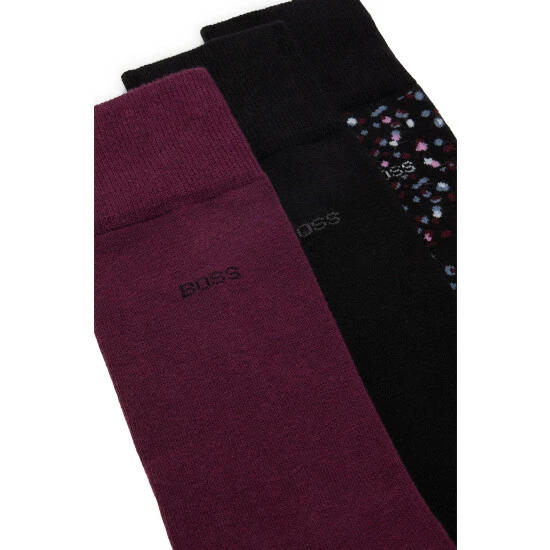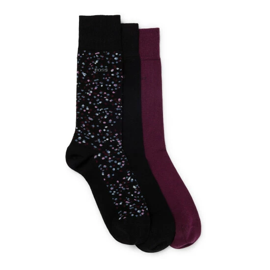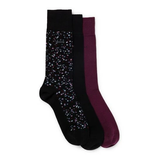 Three-pack regular socks with dotted graphic design offered along with two solid socks, a new black cardboard gift box. Standard length: 30 cm. Certified sustainable soft compact cotton. Gauge 14. Size 40-46.