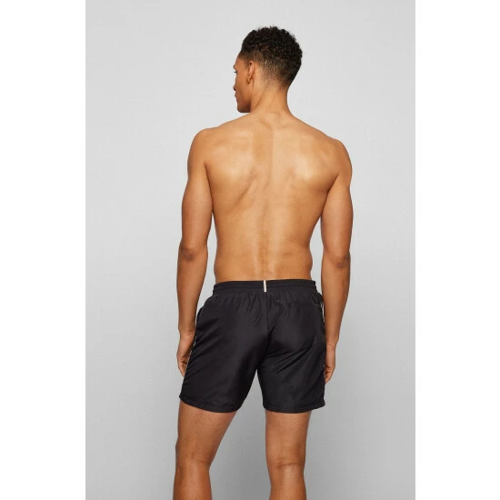 Young and ergonomic. Less water swim trunk . Dope dyed recycled PES. Elastic waistband with outer draw string. Contrast waistband pipings cord and print. Back pocket. Back corporate stripes loop tape. Inner slip with logo tape binding. 41 cm length on size M. Woven quick dry.