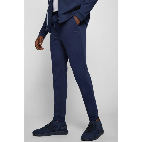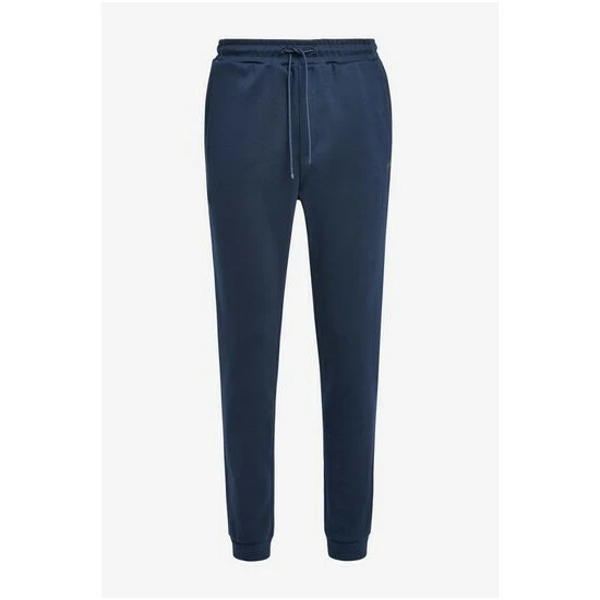 Basic jersey trousers with cuffed hem, responsible quality, main quality combined with tonal pique structure, curved layered logo, smart contrast details on logo, short dipped cord ends.
