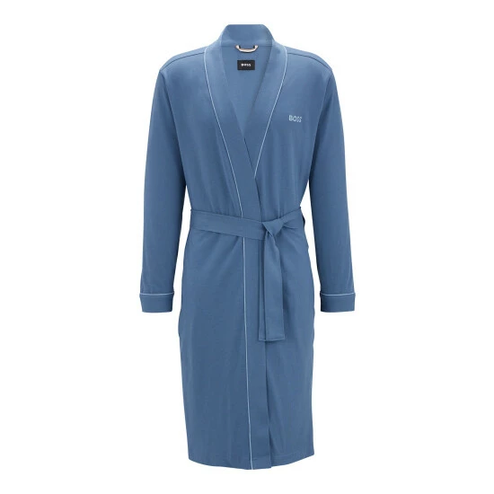 This robe features heavy single brushed 100% cotton, classic kimono style – perfect for home and travelling with front facing and sleeve hem with pipings in contrast colour, logo embroidery on chest in contrast color and side pockets.