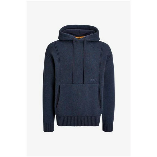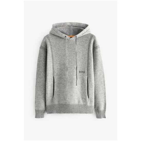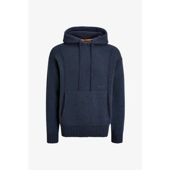 All-over soft English Shetland wool with super melange effect. Front and back travelling rib detail. French shoulder at back with visible fully fashion and outside linking. Orange tape stripe inside back collar. Kangaroo pocket knitted-in. BOSS embroidery logo.