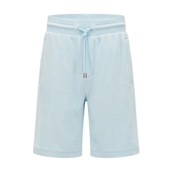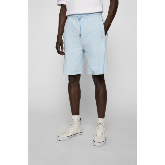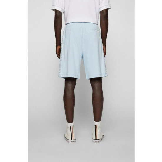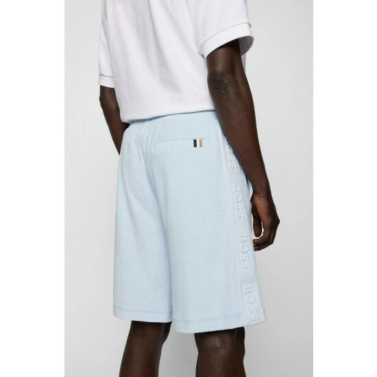 Towelling shorts. Embossed towelling BOSS logo with 3D effect. Flatlock detail on pockets. Hem and fly. Ribbed waistband. Vertical front side pockets. Corporate stripe on the back welt pocket.