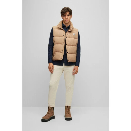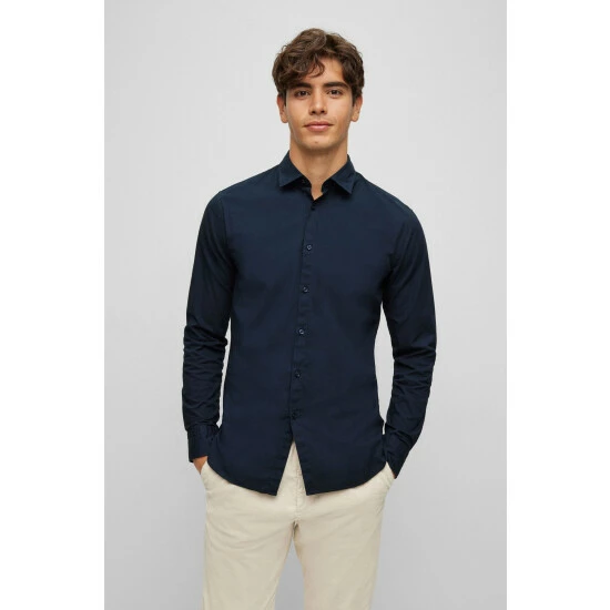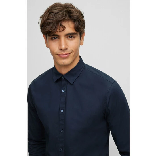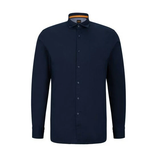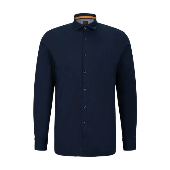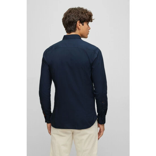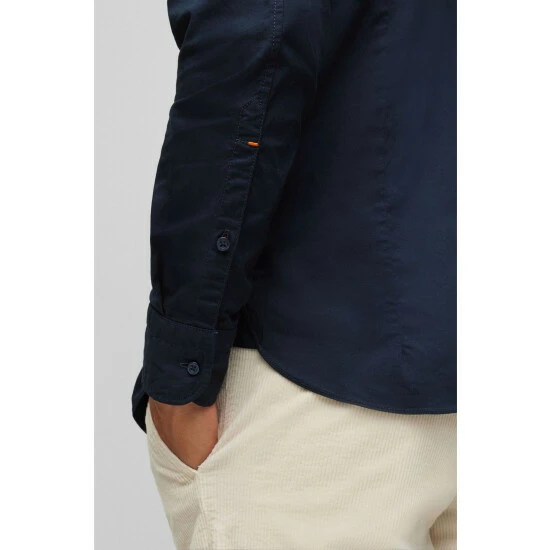 Poplin stretch shirt, sewn all over with thick yarn, orange thread detail on sleeve vent. orange tape applied on the inner collar stand and on the under sleeve vent.