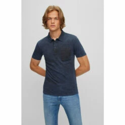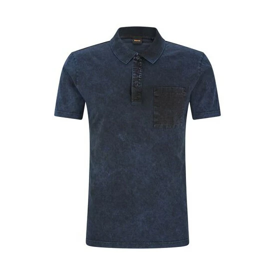 It is a double dye, acid wash look single jersey made with woven fabric used for patched on chest pocket, inside placket and necktape. It features small orange “branding” square embroidered at left side.