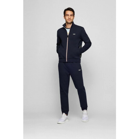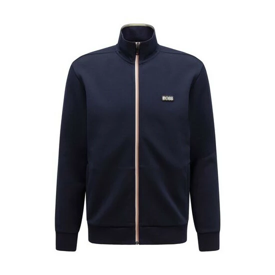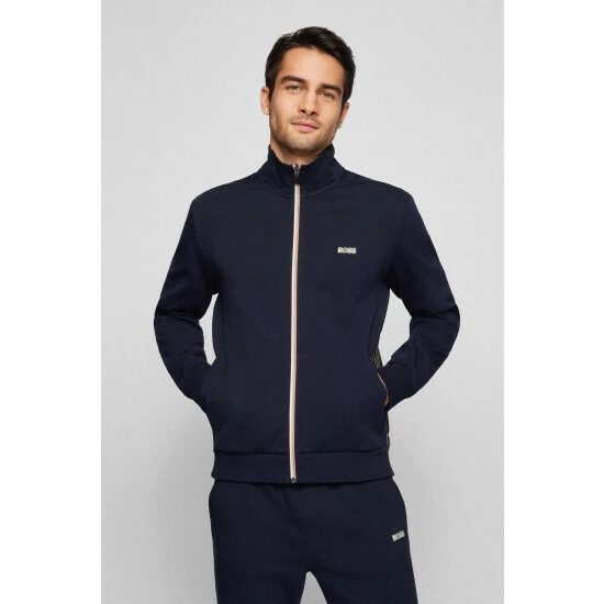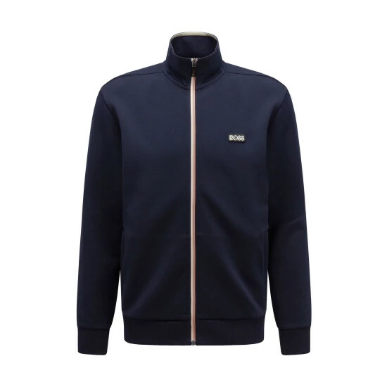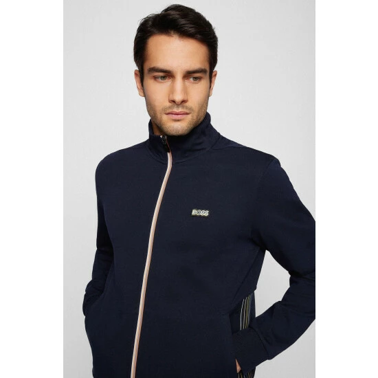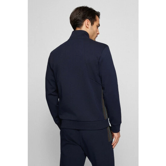 This sweat with stand up collar features knitted tape inserts with multicoloured stripe layout, multicoloured logo badge on chest and front zip opening with multicoloured stripe layout.