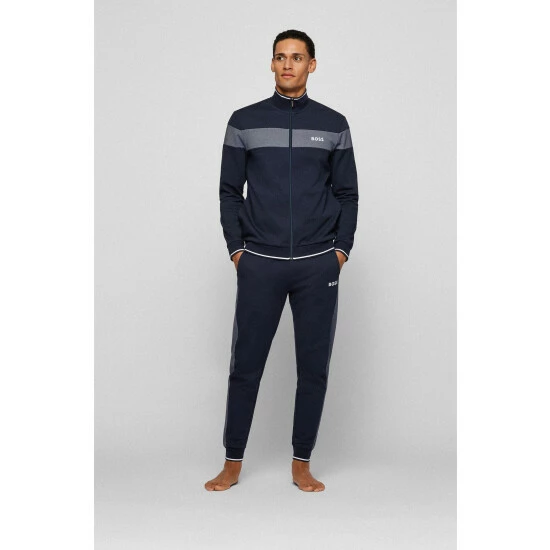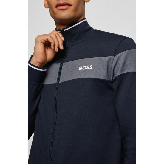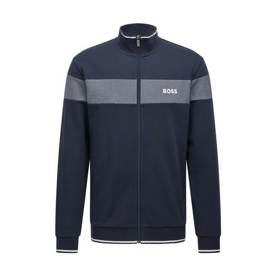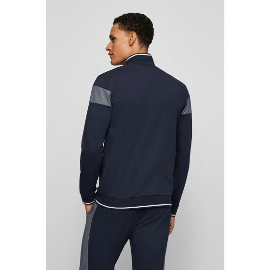 Made with double-dye pique fabric with horizontal single-dye insert on the chest designed with contrast logo embroidery. Featuring contrast stripes on neck and waist hems, metal zip puller and corporate striped necktape.