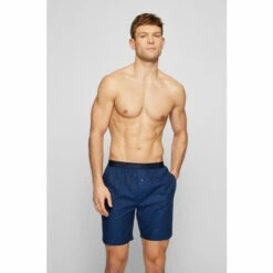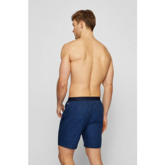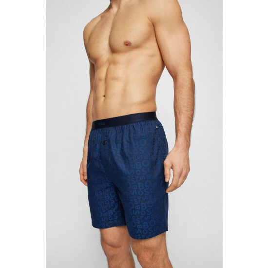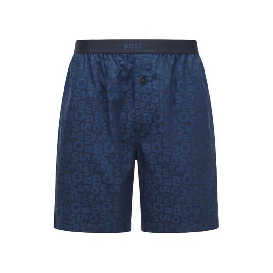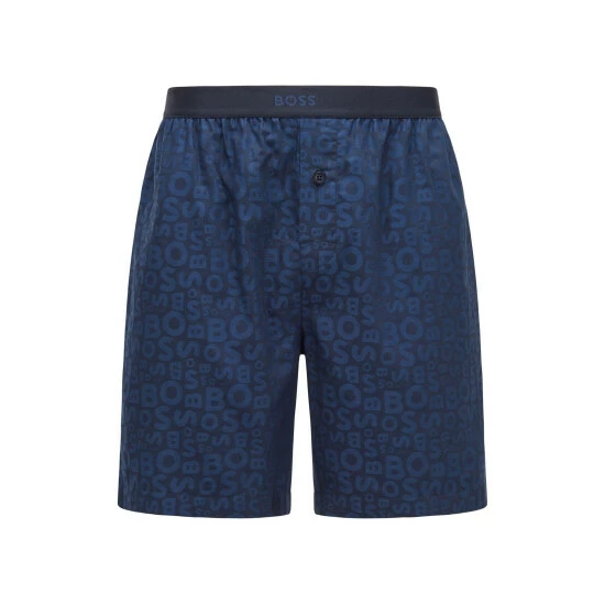This single jersey woven pants with a modern allover BOSS pattern in contrast colour features jacquard logo centre placed on the exposed elastic, side pockets, one-button front opening and corporate striped flag label on side seam.