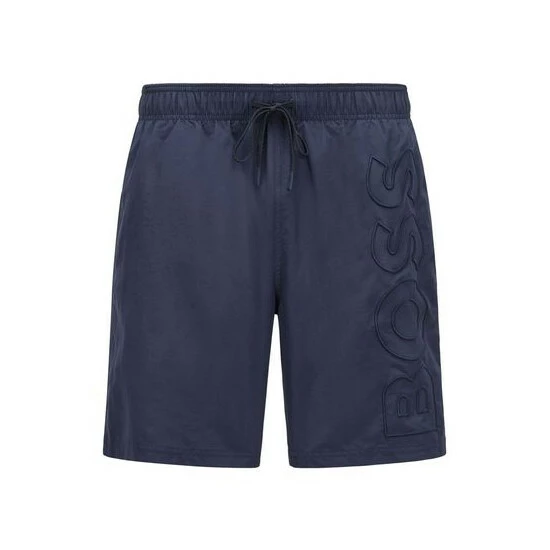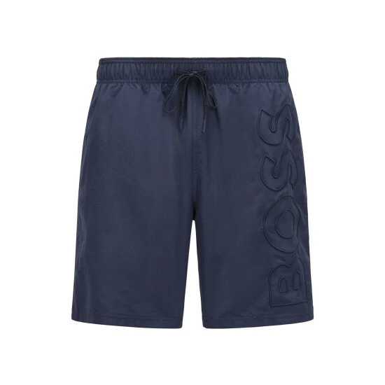 Fully sustainable swim trunk out of recycled polyamide with 3D logo embroidery and patterned flat cords with rubber dipped cord ends. Featuring back corporate stripes loop tape and back pocket.