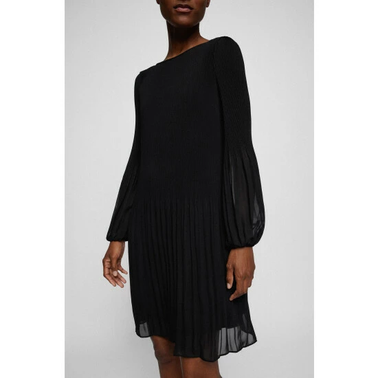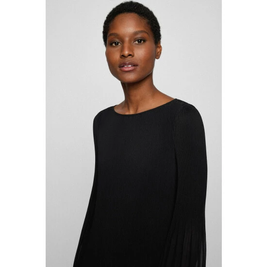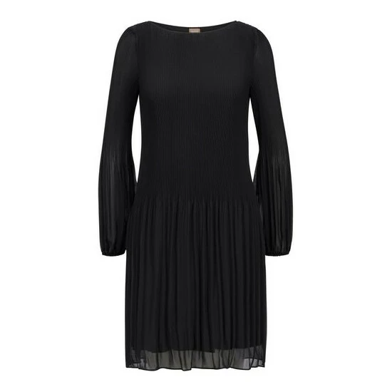 This plisse dress features slim shape, elastic sleeve hem for comfortable wearing, round neckline, partially lined and recycled polyester.