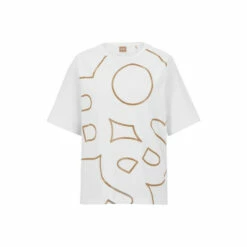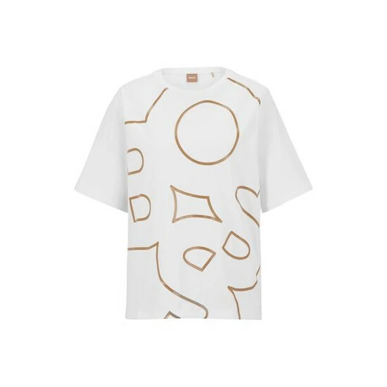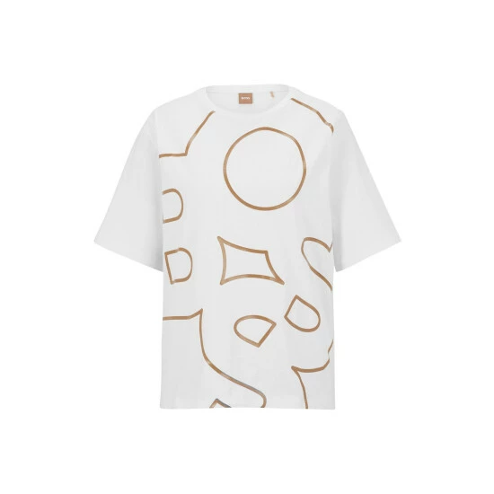 Relaxed fit T-shirt. BOSS logo artwork out of shiny gloss print with 3d effect. Icon ic tape at side seam slits. Iconic flag at centre back.