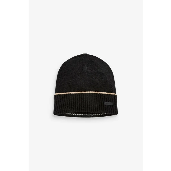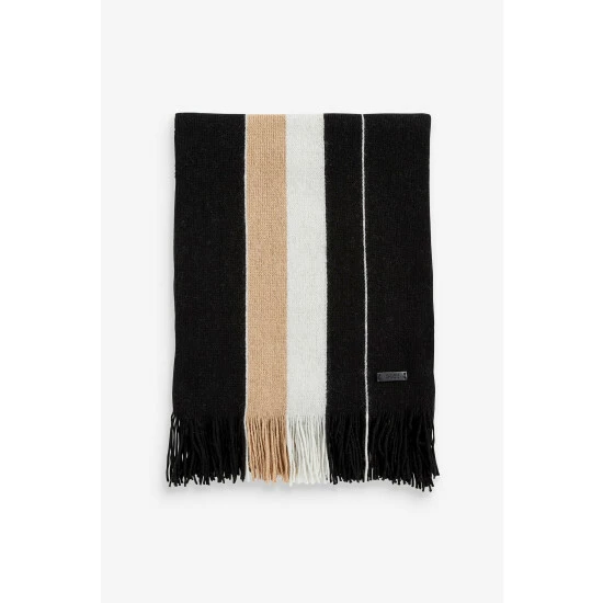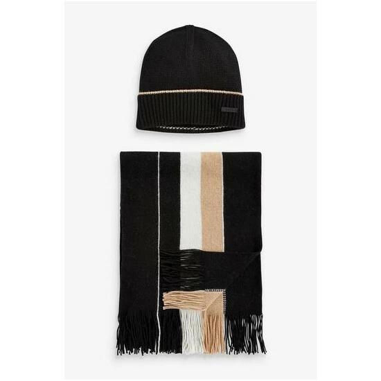 Features plain knitted raschel scarf with placed iconic stripe, woollen hand feel, plain knitted hat with colour tipping and inside iconic stripe detail, fake leather logo plaque and set sold in a gift box.