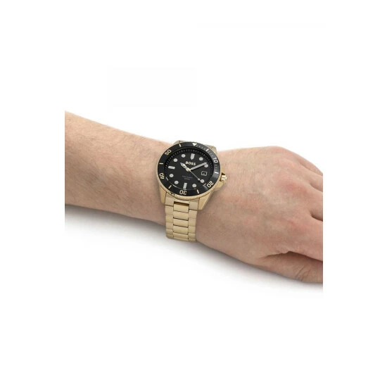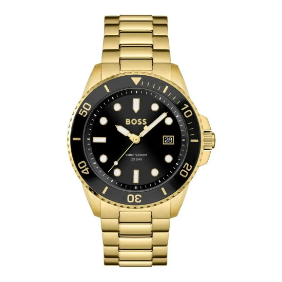 Fulfilled by WatchShop – BOSS gents watch from the Ace family. Featuring a 43mm yellow gold IP stainless steel case with black bezel, black sunray dial and yellow gold IP stainless steel bracelet with push button deployment. Water resistant to 20ATM.