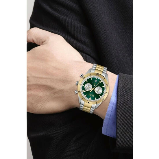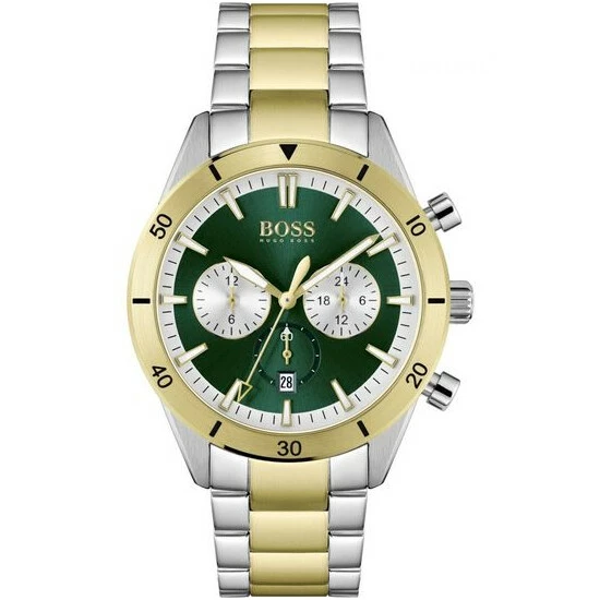 Fulfilled by WatchShop – BOSS gents watch from the Santiago family. Featuring a 44mm stainless steel case with a gold IP bezel, dual time movement, green dial and two-tone gold IP and stainless steel bracelet. Water resistant to 5ATM.