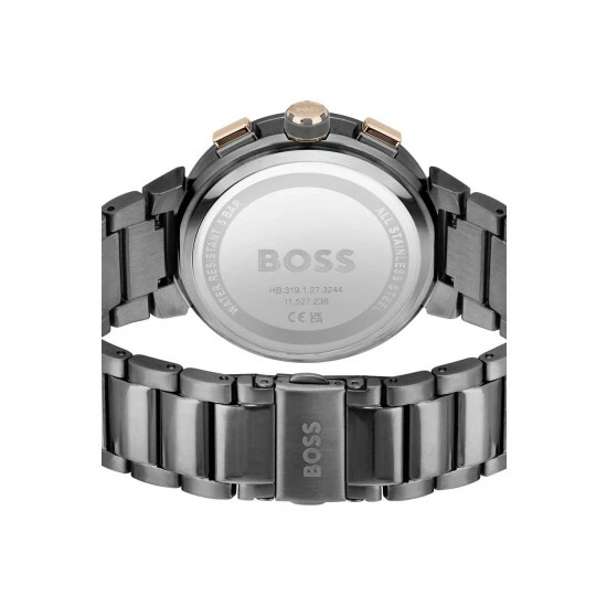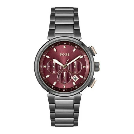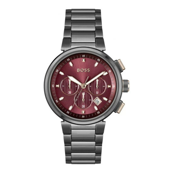 Fulfilled by WatchShop – BOSS gents watch from the One family. Featuring a 44mm IP grey case, burgundy dial and grey IP bracelet. Water resistant to 5ATM.