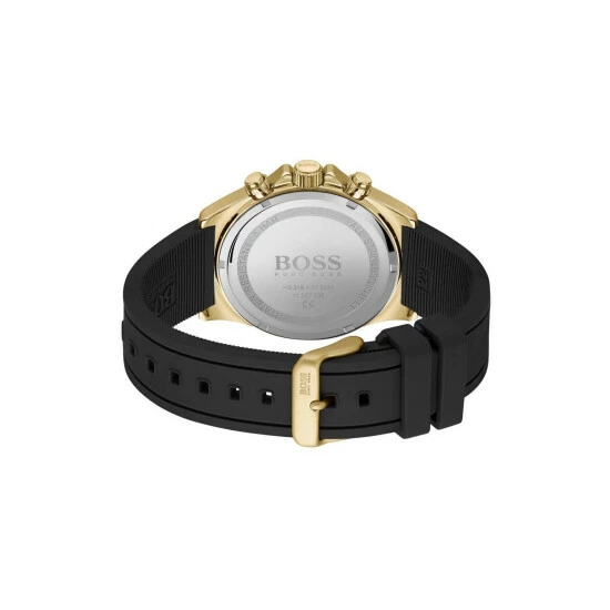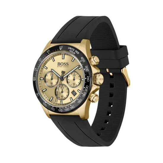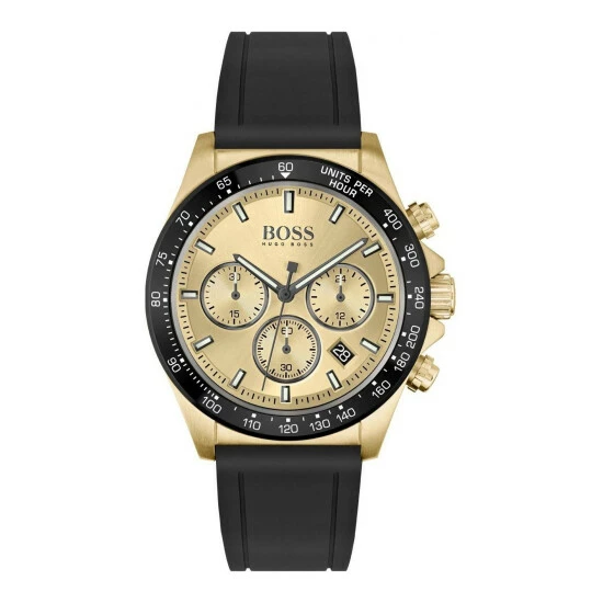 Fulfilled by WatchShop – BOSS gents chronograph from the Hero family. Featuring a 43mm gold IP case, gold sunray dial, black tachymeter bezel, black silicone strap and BOSS buckle. Water resistant to 5ATM.