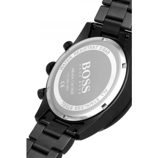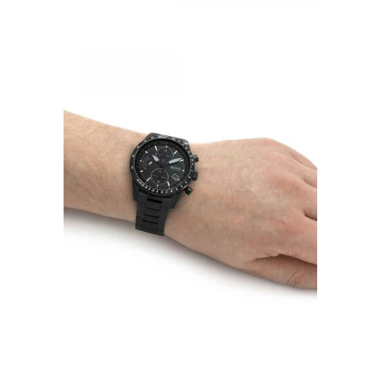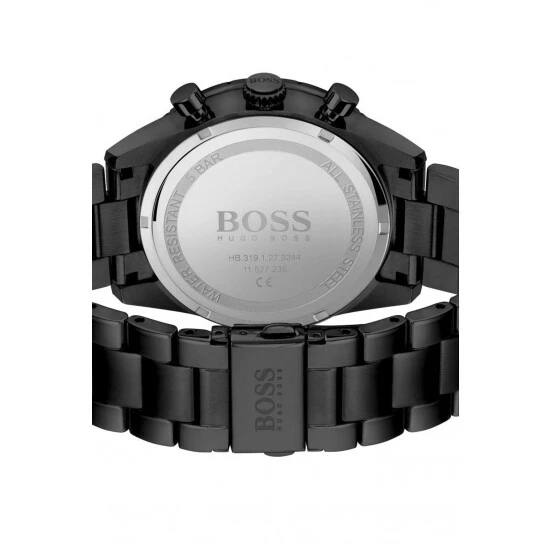 Fulfilled by WatchShop – BOSS gents watch from the Pilot Edition Chrono family. Featuring a 44mm black IP stainless steel case with slide-rule bezel, retrograde chronograph movement, black dial and black IP stainless steel bracelet. Water resistant to 5ATM.