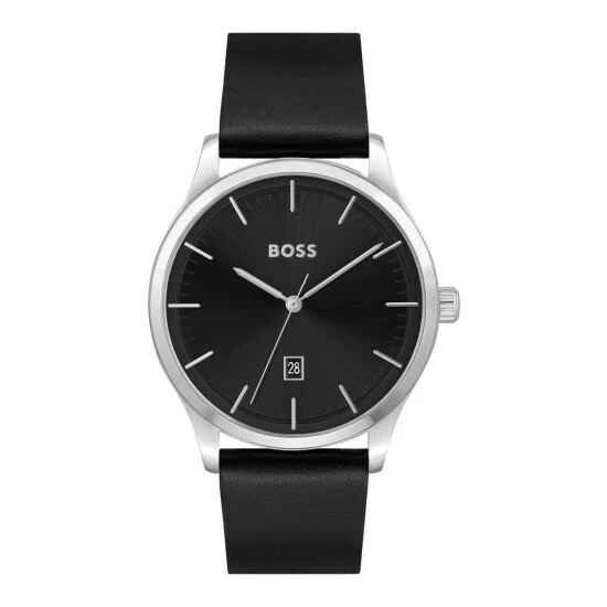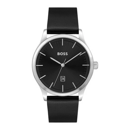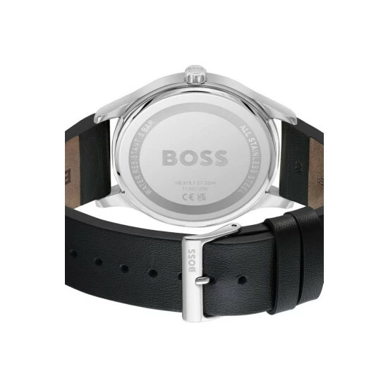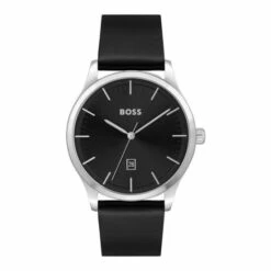 Fulfilled by WatchShop – BOSS Gents watch from the Reason family. Featuring a 43mm stainless steel case, a black dial finished on a black leather strap. Water resistant to 5ATM.