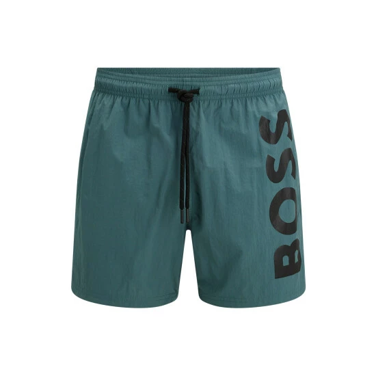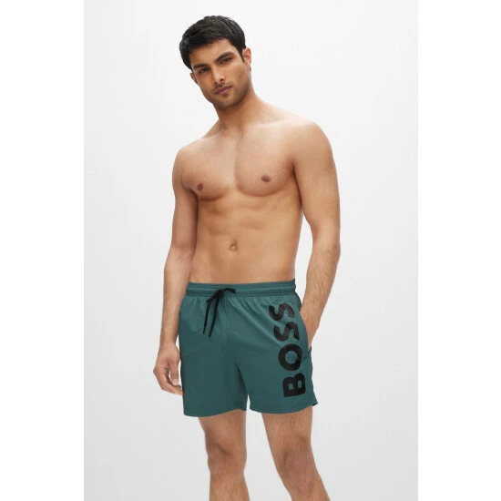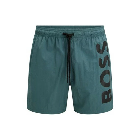 These shorts are woven quick dry, featuring elastic waistband with outer cord, medium length and comfortable fit, big logo print in contrast colour on left leg, ergonomic sideseam and back pockets, back corporate stripes loop tape, and inner slip with logo tape binding, side.