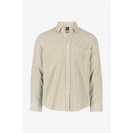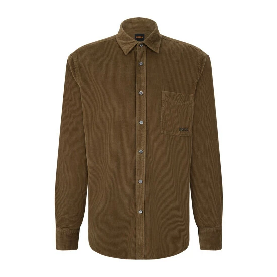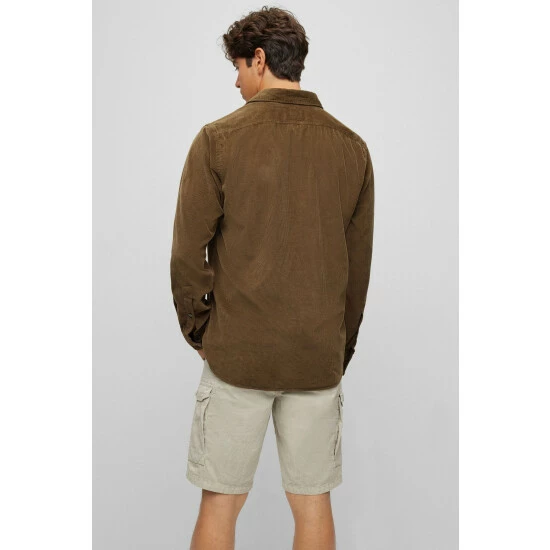 Soft corduroy garment dyed. BOSS logo embroidery slightly in contrast on left pocket. Lower button on cuff attached with orange thread.