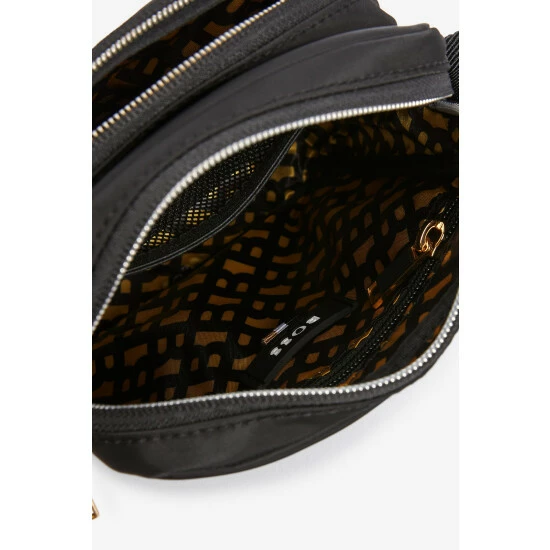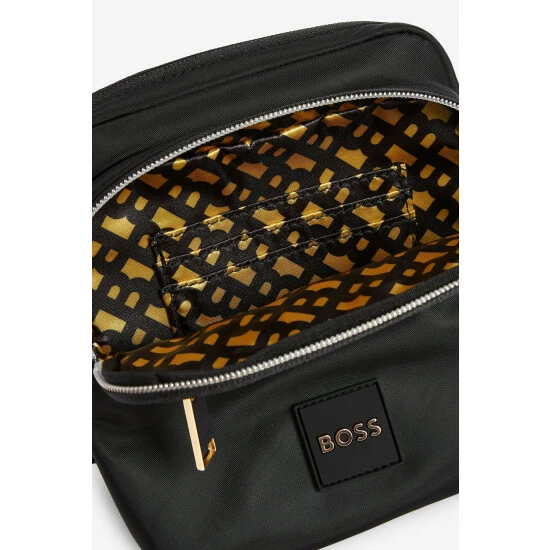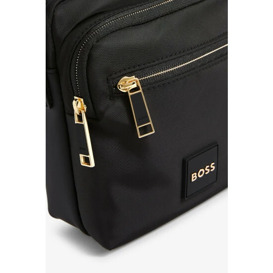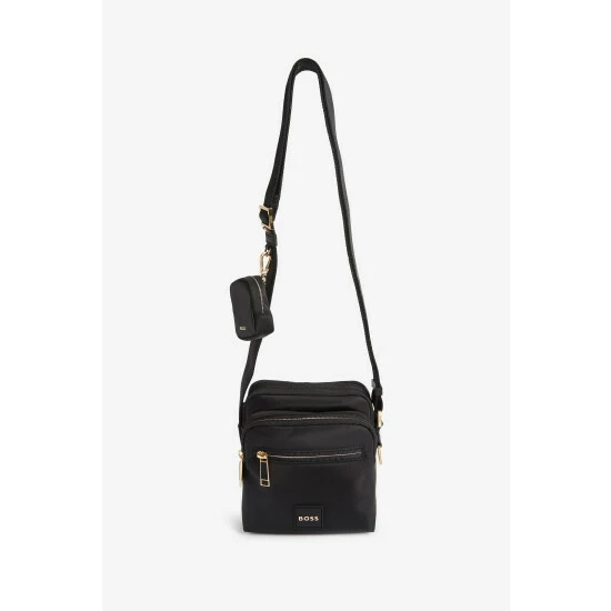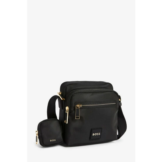 Featuring hardware in golden colour, logo relief on silicon patch: Two main compartments, adjustable shoulder straps, two front zip pockets, detachable headphone case, inside two additional open pockets, and elegant polyester small texture. Semi shiny look, smooth hand feel 16x7x17.5cm.