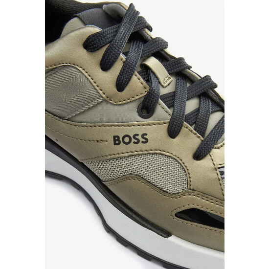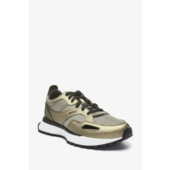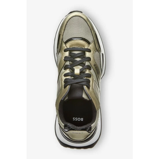New BOSS contemporary design sneaker. New EVA lightweight sole with rubber bottom. Mix material: PU, Mesh, Nylon. Metallic execution of the upper with touch of pop colours. Upper enriched by BOSS logo on the side.