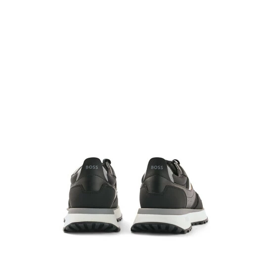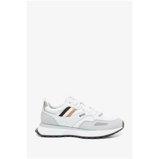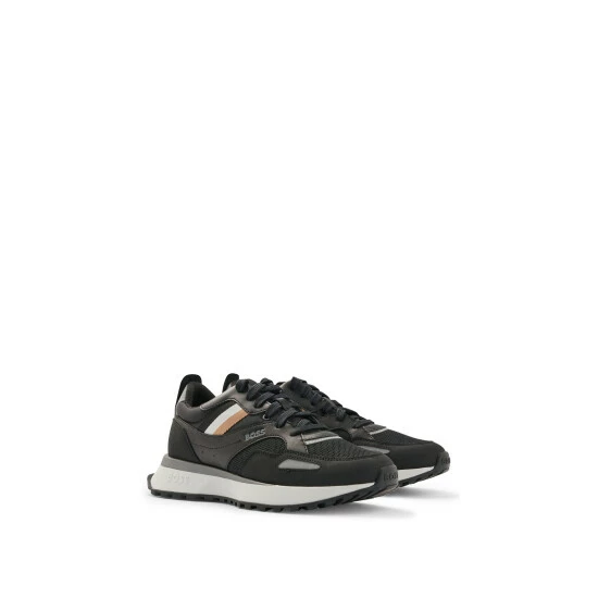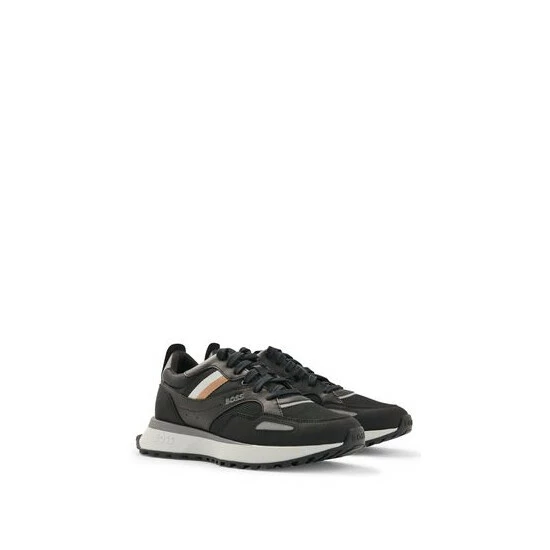 New BOSS contemporary design sneakers. New EVA lightweight sole with rubber bottom. Mix material: PU, Mesh, Nylon and fly leather. Upper enriched by BOSS logo on the side and institutional tape.