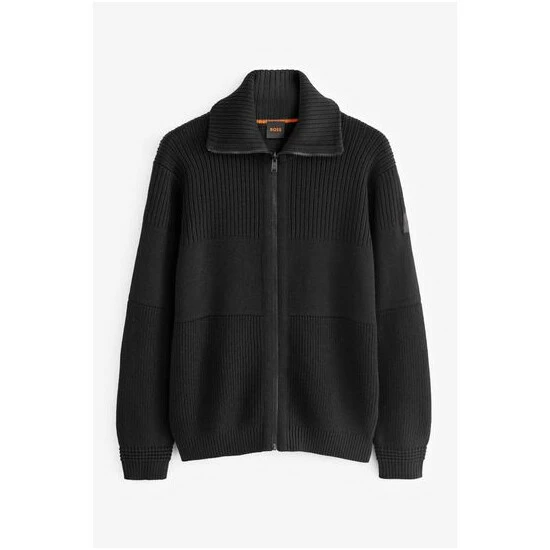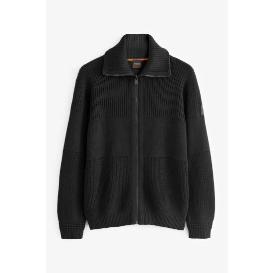 Features an all-over structure block change, French shoulder to back with visible fully fashion marks and outside linking, Ottoman detail at cuffs, orange knitted stripe inside collar, knitted tape attached on top of zip and a silicon logo badge.