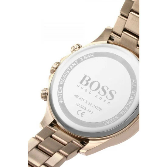 Fulfilled by WatchShop – BOSS ladies watch from the Hera family. Featuring a 38mm carnation gold case with crystal bezel, blue dial and carnation gold IP bracelet. Water resistant to 3ATM.