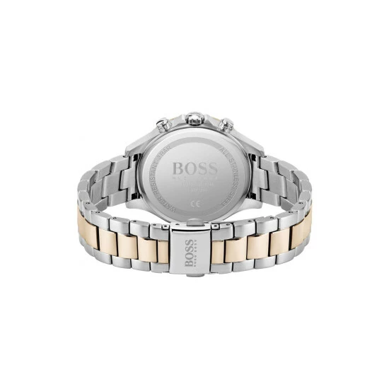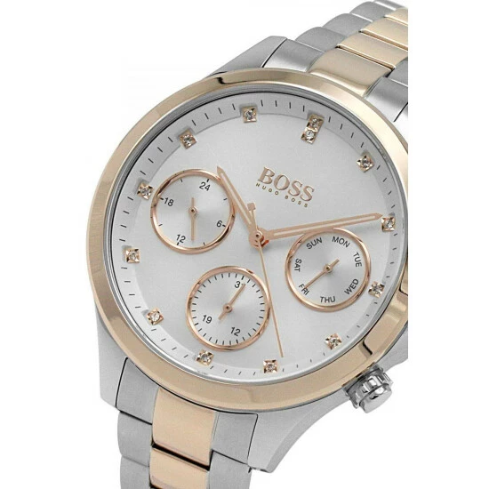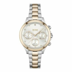 Fulfilled by WatchShop – BOSS ladies’ watch from the Hera family. Featuring a 38mm stainless steel case with carnation gold IP bezel, a silver white dial with crystal markers and two-tone stainless steel and carnation gold bracelet. Water resistant to 3ATM.