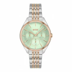 Fulfilled by WatchShop – BOSS ladies’ watch from the Saya family. Featuring a 37mm stainless steel case with crystals, a carnation gold IP bezel, a green sunray dial and two-tone carnation gold and stainless steel bracelet with push-button deployment. Water resistant to 3ATM.