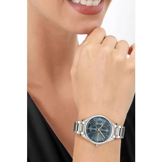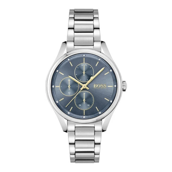 Fulfilled by WatchShop – BOSS ladies watch from the Grand Course family. Featuring a 36mm stainless steel case, blue sunray dial with crystal detail, stainless steel bracelet and push button deployment. Water resistant to 3ATM.