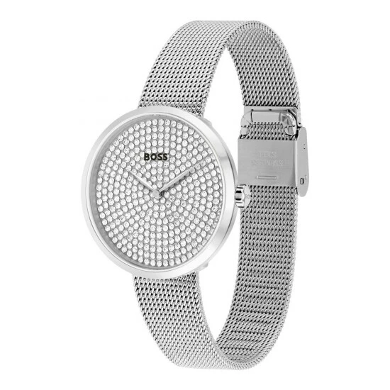 Fulfilled by WatchShop – BOSS ladies watch from the Praise family. Featuring a 36mm stainless steel case, silver-white dial with crystals, stainless steel mesh bracelet. Water resistant to three ATMs.