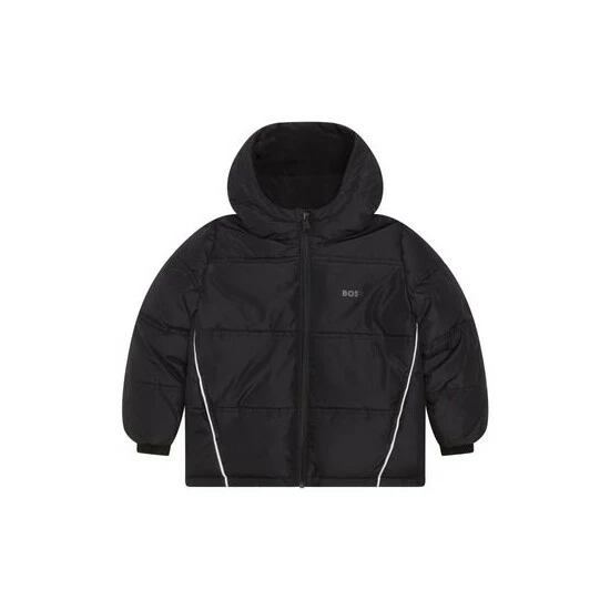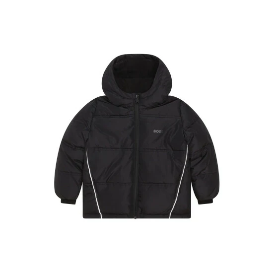 Made of 100% polyester, this long sleeves hooded-down jacket features embossed branded taffetas lining, zip fastener, front pockets and BOSS print on the front chest and bottom back.