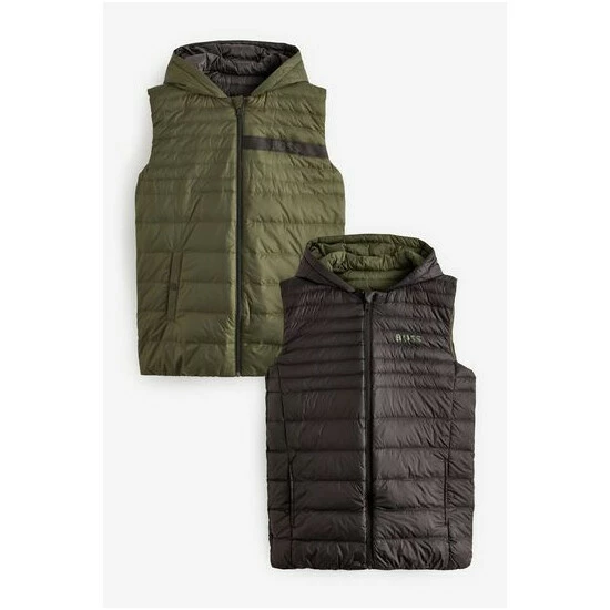 Made of 100% polyamide, this hooded sleeveless down jacket is a repellent. Featuring white padding 90% down 10% feather of animal origin goose and duck, reversible, zip fastener, pockets on both sides, band with “BOSS” jacquard on the chest.