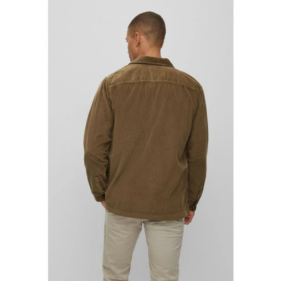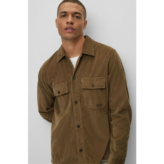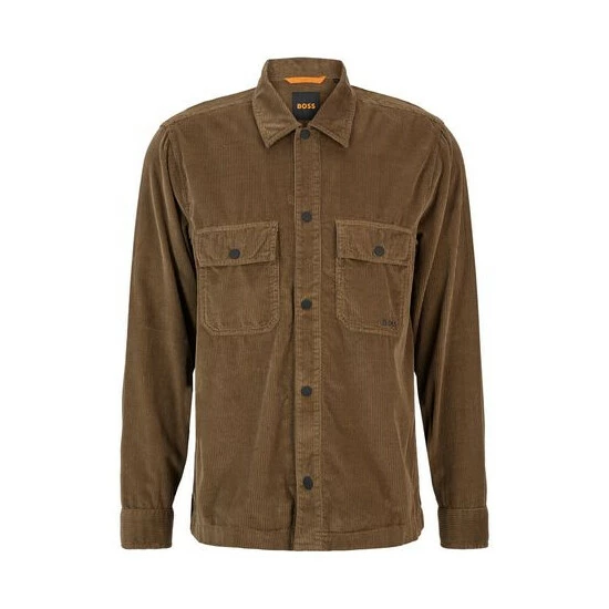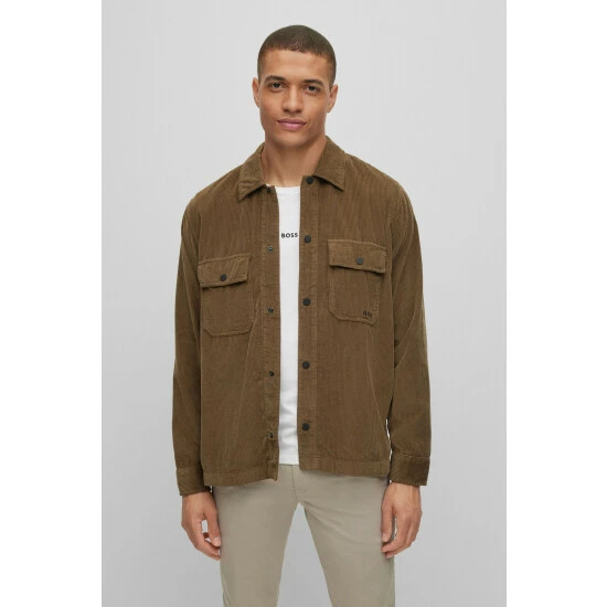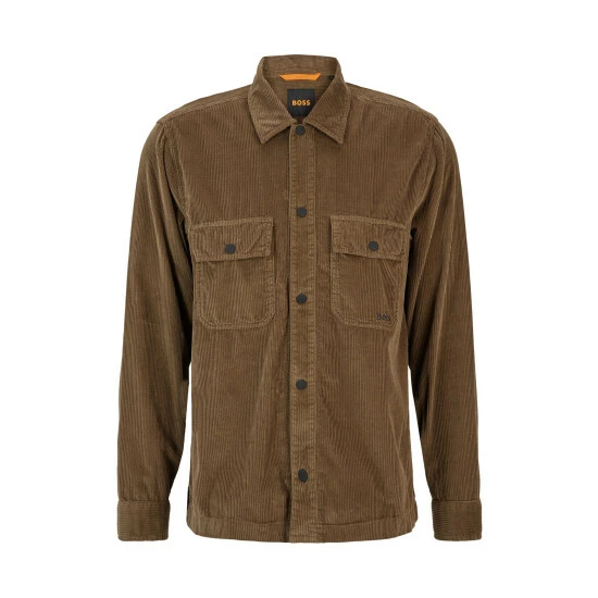 Soft corduroy garment dyed. Over shirt form. BOSS logo embroidery slightly in contrast on left pocket. Orange loop hanger inside the collar. Press buttons.
