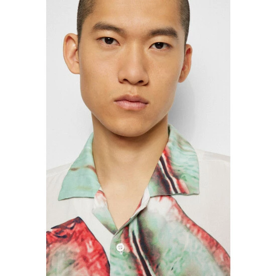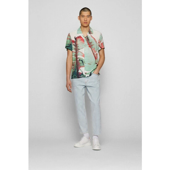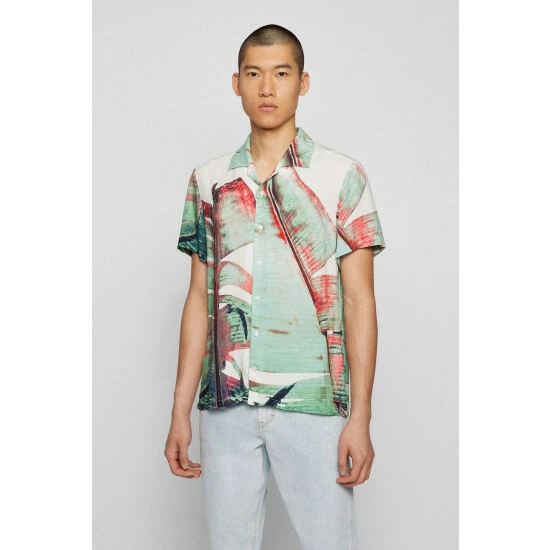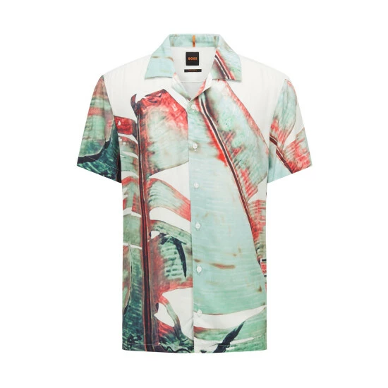 It is designed with bold leaf print special placement. Made with soft viscose base, featuring vertical orange tape applied on inner collar stand and rubberised buttons.