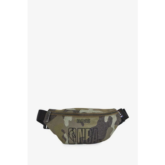 Responsible. Polyamide with firm hand feel and visible texture. Plain and with all-over printed pattern. Main zip compartment. Zip pocket on back. Adjustable waist belt. 28 x 13 x 7 cm.
