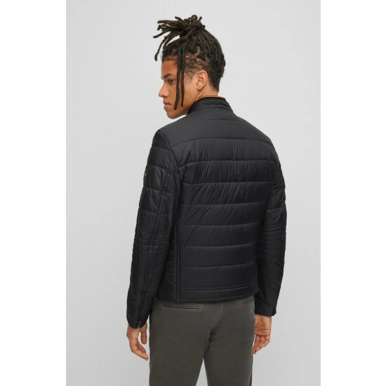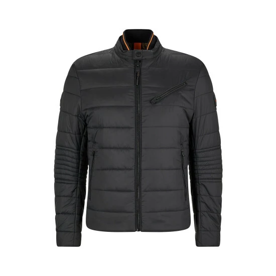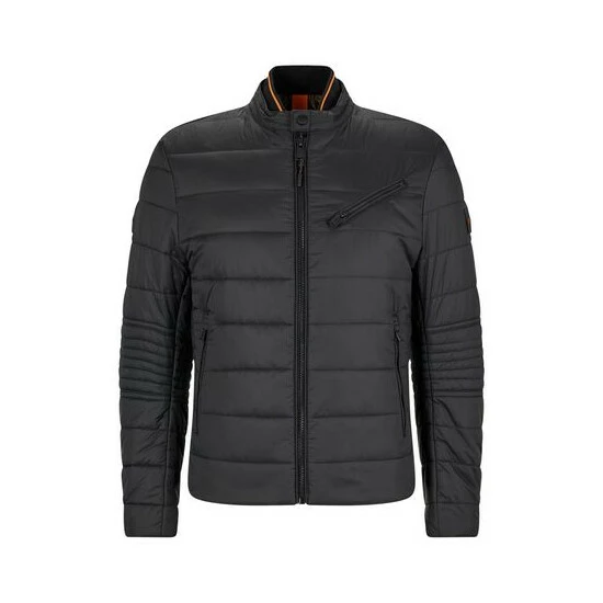 Classic biker jacket. Recycled matt ultra lightweight nylon. Diagonal zipper chest pocket. Bold zipper pockets on the sides. Cuffs with zipper opening. Internal knit-rib at collar with orange tipping.