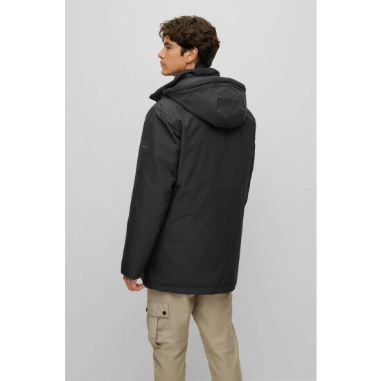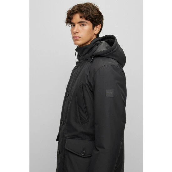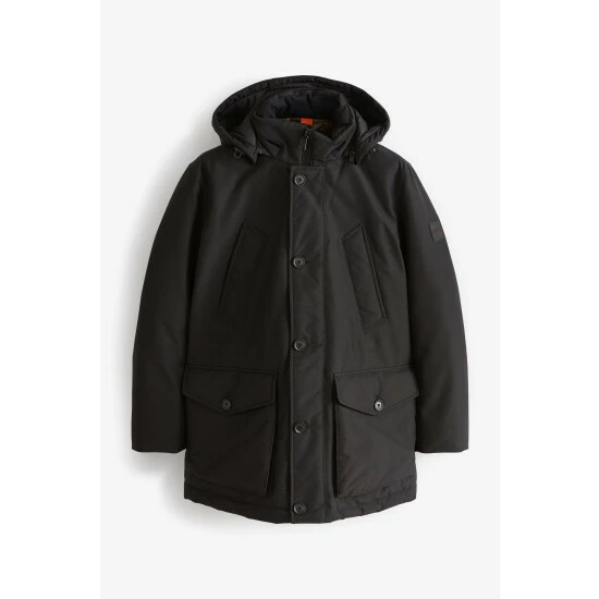 Basic Arctic parka in rich Ottoman fabric. Removable hood with adjusters. Knit-rib inside collar. Diagonal welt pockets at chest. Flap pockets with four-hole buttons.