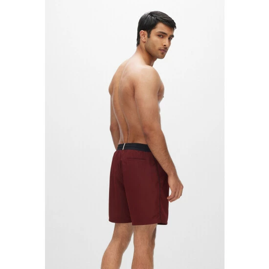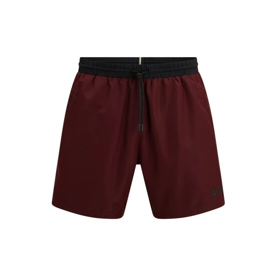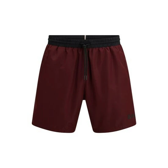 A young and ergonomic responsible swim trunk made out of recycled PES. It features an elastic waistband with outer drawstring, contrast waistband, back pocket/back corporate stripes loop tape, inner slip with logo tape binding, 41 cm length on size M and woven quick dry.