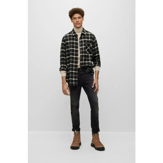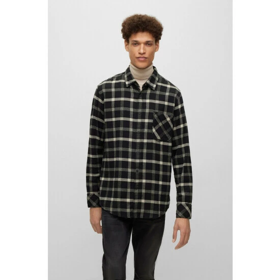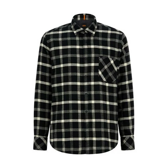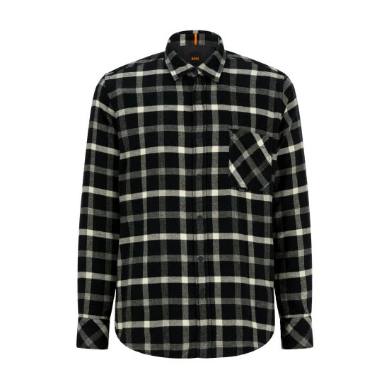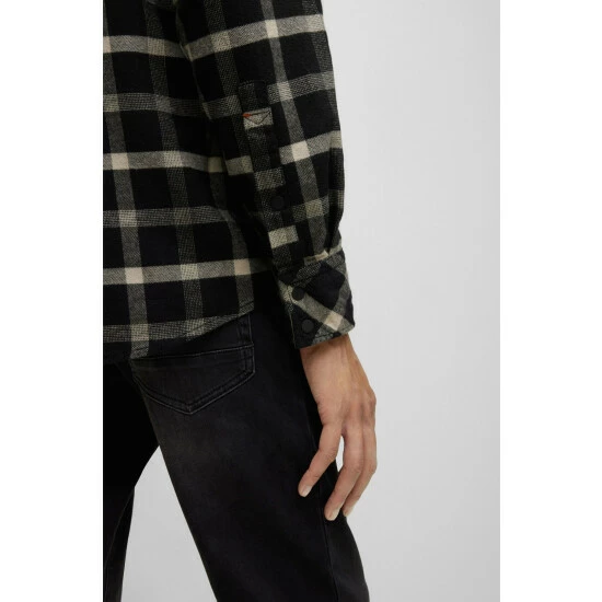 Responsible light flannel. Contrast fabric on inner back yoke. Press buttons. Sleeve vent bartack done with orange thread. Vertical orange tape on inner-collar stand.