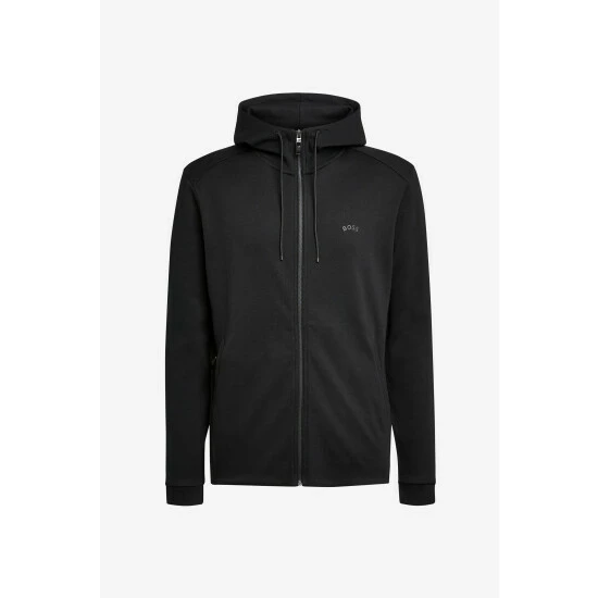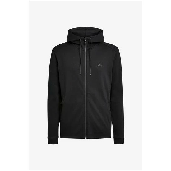 Basic zip-through sweat with hood. Responsible quality. Main quality combined with tonal pique structure. Additional zipped phone pocket. Curved layered logo. Smart contrast details on logo, on inside mesh neck tape and on zip teeth. Short dipped cord ends.