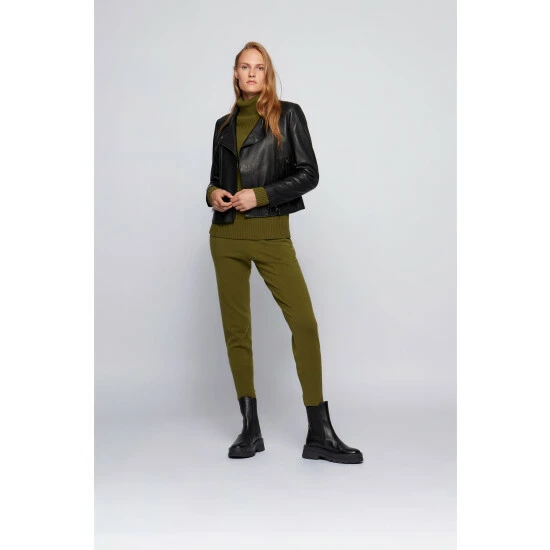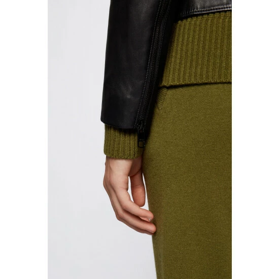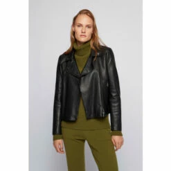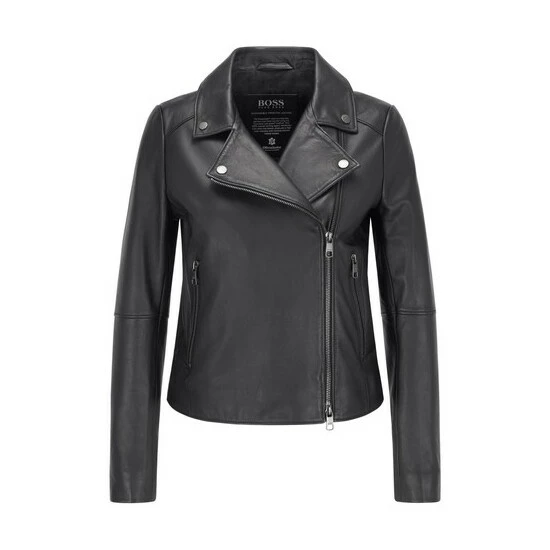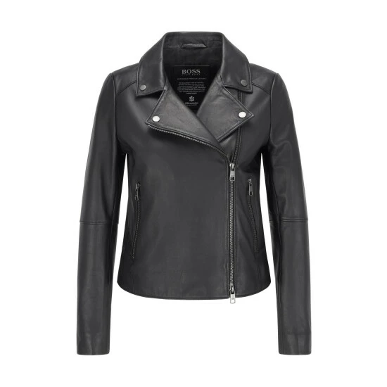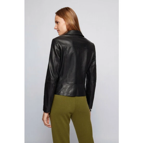 Classic biker jacket in responsible wet green leather / special printed leather badge inside for branding / tonal jacquard logo lining / iconic stripe hanger loop.